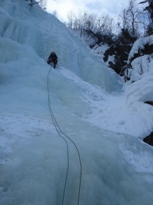 Maanantaina on yhtä kylmä kuin sunnuntainakin, mutta lepopäiväkortti on jo pelattu. Annamari ja minä kiipeämme Fabrikkfossenin. Reitti on merkitty topoon 7 köydenpituuden mittaiseksi. Olisikohan se jotain 300 metriä? Vaikea sanoa, koska viisi ekaa kp:tä kiipeämme yhtäaikaisesti ja pitchaamme vain kaksi viimeistä, niin että saamme nousun suoritettua 3,5 tuntiin. Ei ongelmia, alaskin pääsemme hyvissä ajoin. Pohkeissa kyllä tuntuu. Sillä aikaa Suski ja Elisa ovat rimpuilleet Krokanin alueella jotain nelosta.