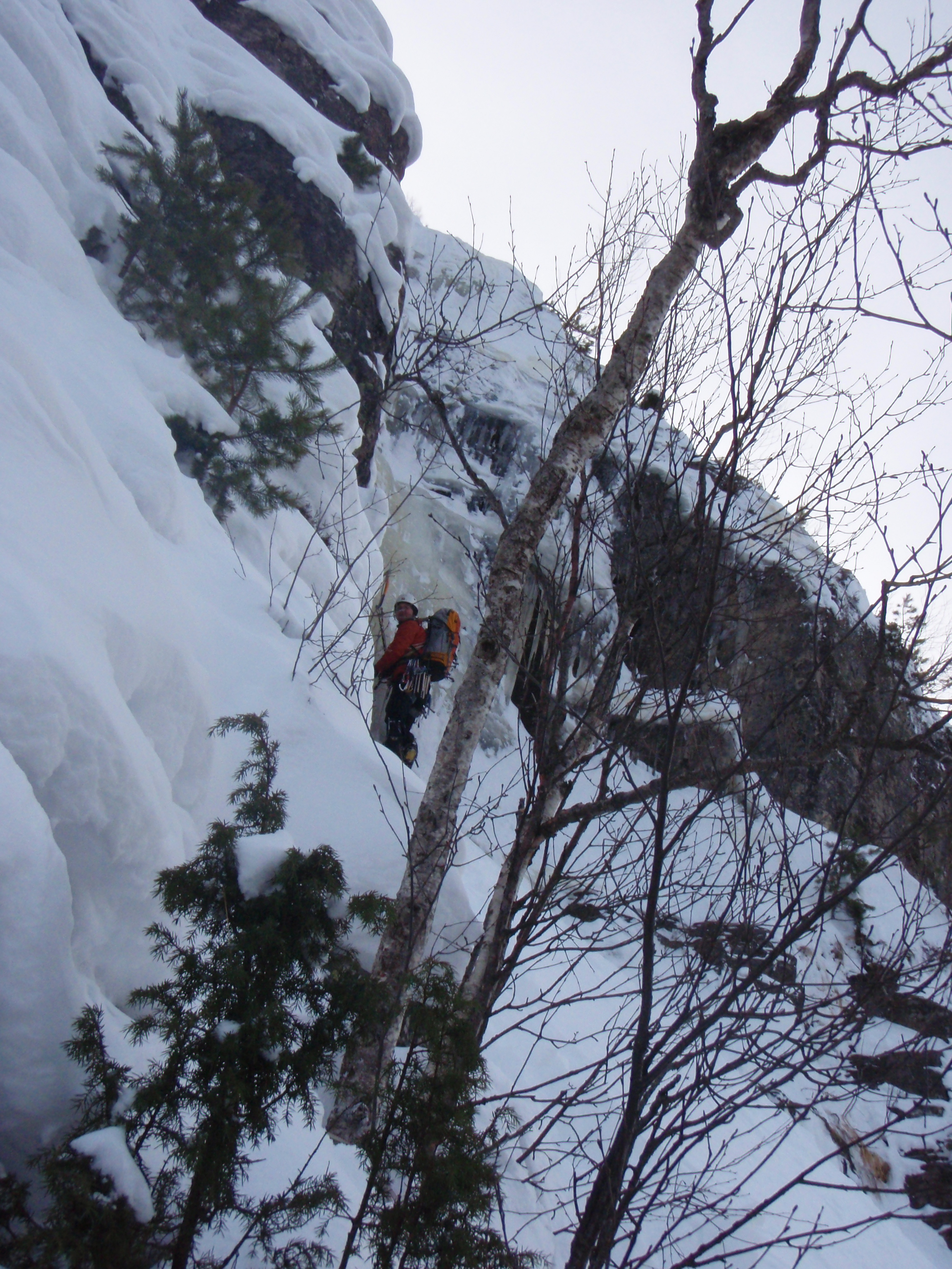 Kun sitten aikanamme kahlaamme haarovälejämme myöten puuterissa ja huomaamme, että lyhyt lähestyminen kestääkin kokonaisen tunnin, ja kun Suskin paleltumat varpaissa vaativat kenkien avaamista ensimmäisen köydenpituuden jälkeen, ja kun kaksi ensimmäistä ihan tappiin asti vedettyä 60-metristä kp:tä eivät vielä johda lähellekään reitin loppua, alkaa näyttää siltä, että päivästä tulee ennakolta arvelemaamme pidempi. Niin kuin tulikin. Ehkä koko reissun paras päivä, juuri siksi, että ei ollut liian kevyttä. Mitä jääkiipeilyä se sellainen olisi, jossa ei koskaan tulisi sitä tunnetta, että olisinpa jo tuolla alhaalla?