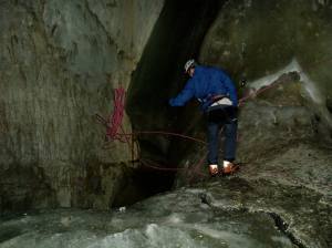 Ulos luolasta pääsi nelosen jäätä yläköysittelemällä (olettaen, että oli tajunnut jättää matkan varrelle köyden). Ensimmäisellä Parmelanin-visiitilläni olin liikenteessä Rouhiaisen Jukan kanssa kahdestaan. Jälkikäteen ajateltuna se oli vähän höpsö ratkaisu: jos jotain olisi mennyt mönkään, olisi kulunut kohtalainen tovi, ennen kuin toinen olisi päässyt edes kännykkäkenttään käsiksi.