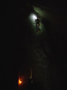 Viitisentoista metriä pinnan alla. Luola on paljon isompi kuin osasin odottaa. Ilman salamavaloa ja otsalamppua on jopa melko pimeää. Maan pinnalle joutuu chimney-pönkeilemään, ja jos valitsee reittinsä niin kuin me, saa vähän ähkiäkin.