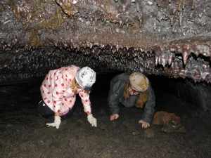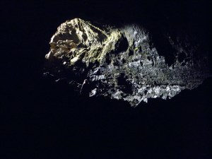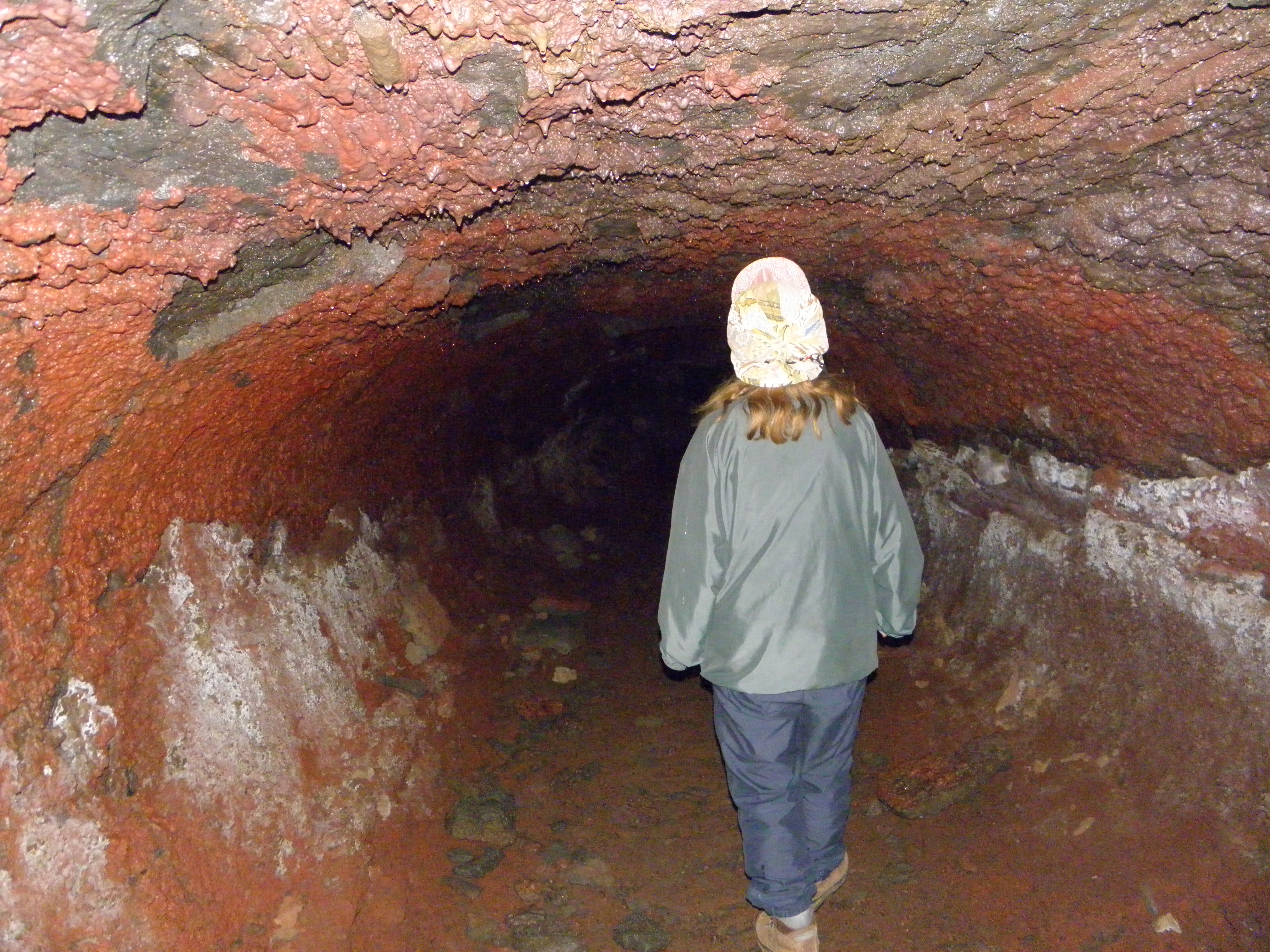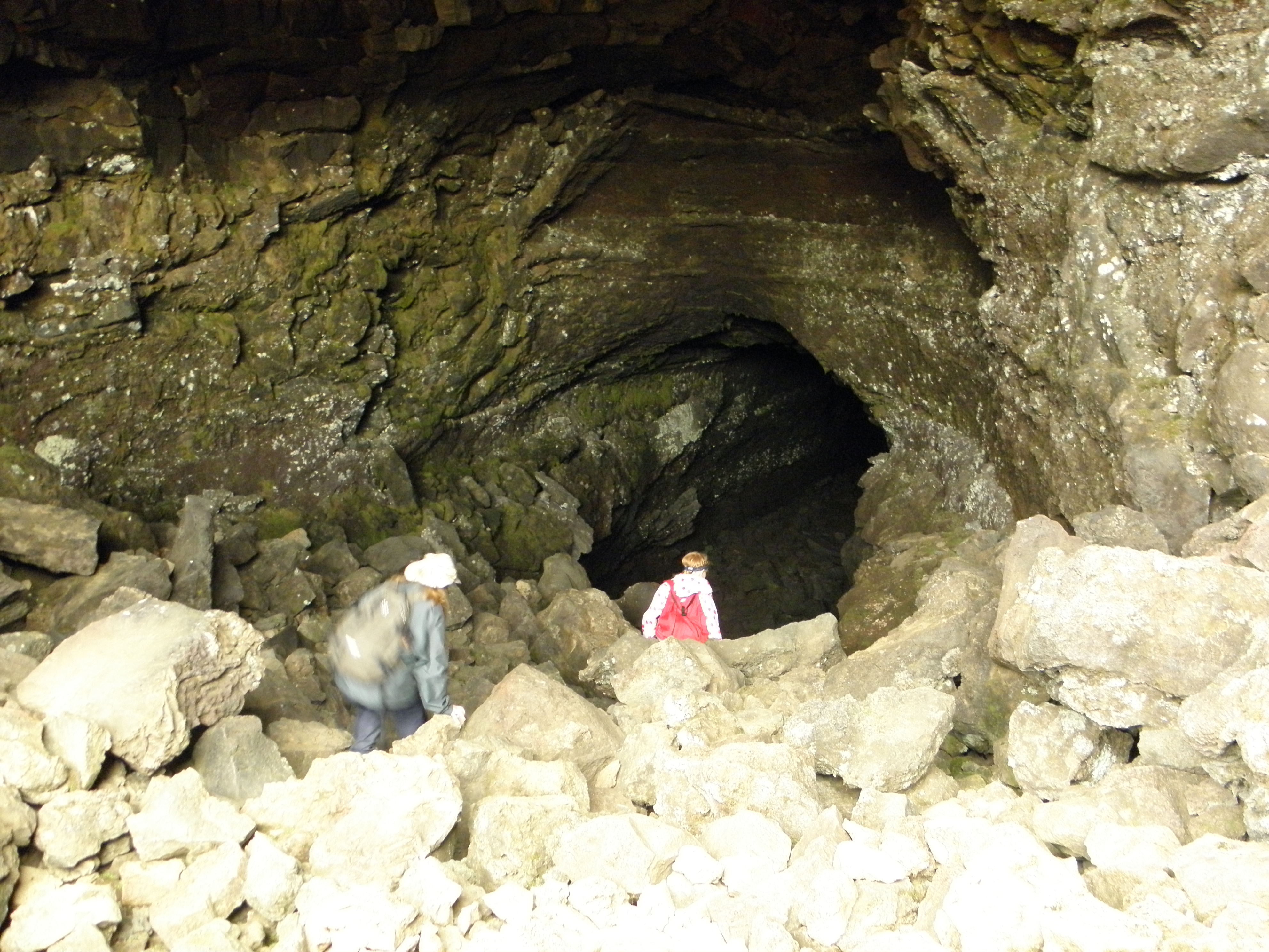 Laavakentällä meitä vaivasivat pienet kärpäset, jotka menivät silmiin ja hengityselimiin, mutta jopa 9-vuotias tyttäremme pärjäsi aika hyvin. Tällä kertaa luola, Surtshellaren, oli kaiken kävelemisen arvoinen: lähimmältä sisäänkäynniltä pääsi puolen kilometrin päähän (se on jo melko jännittävä etäisyys maan pinnalle), ja paikka oli muutenkin aika iso. Tällainen: