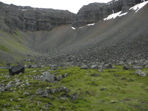 Serkkuni Nadjan ja miehensä Eiríkur Örnin luona Ísafjörđurissa viihdyimme sen verran pitkään, että yhtenä päivänä ennätimme käydä vähän rinteessäkin. Vuonoa reunustavasta vuoresta löytyi patikoitavan näköinen kohta. Ensin tuonne syvennykseen ja sitten sen vasenta laitaa ylös: