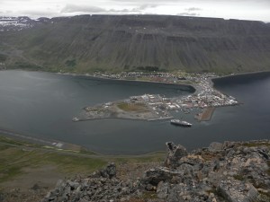 Siitä eteenpäin nousu oli kiusallista ja vähän vaarallistakin irtokivisotkua, mutta mäen päällä oli käytävä ihan harjoitusmielessä, ja olihan sieltä hienot näköalat. Kuvassa Ísafjörđur.