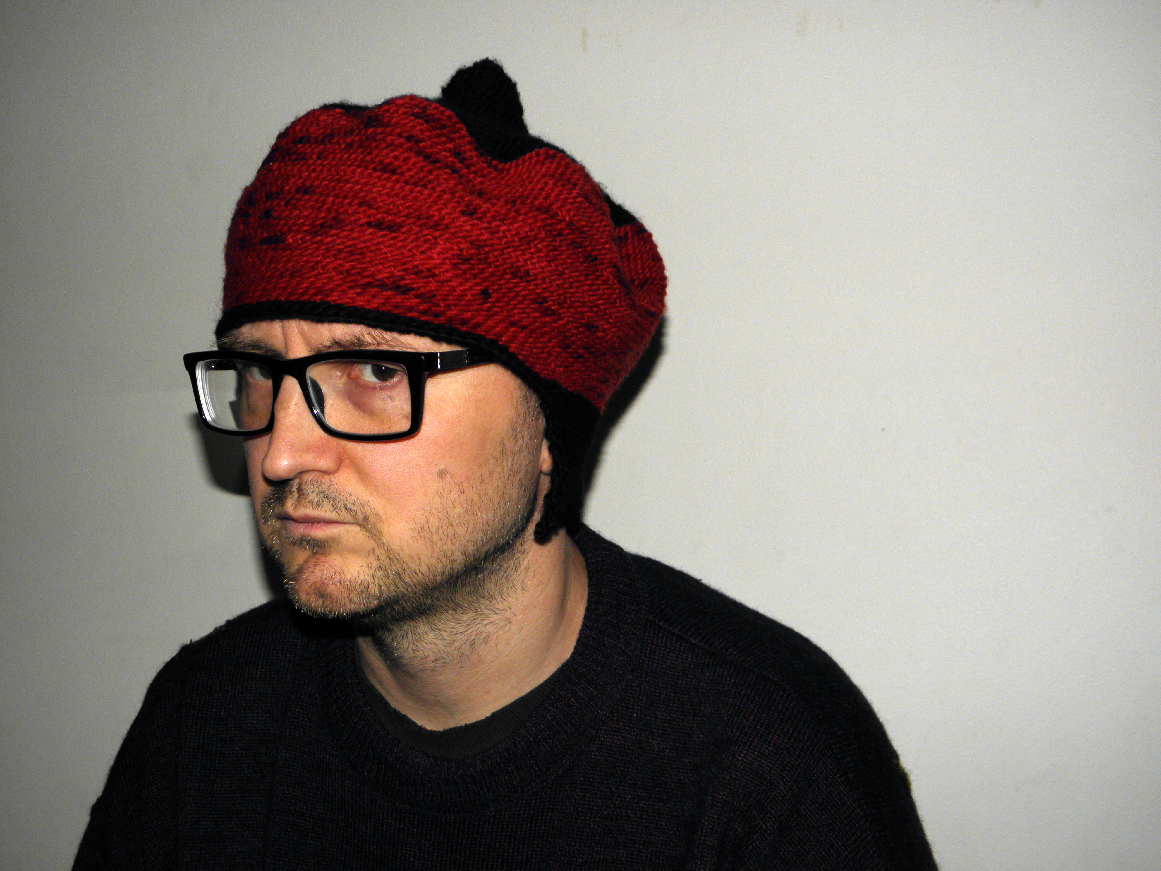 Tuumasta toimeen. Pipo-ohjeet löydän jostain lumilautailusivuilta, ja alan koukuttaa niiden mukaan. Tavoitteenani on tehdä ihan tavallinen punamusta pipo. Ensimmäisen illan tuotos on vaatimaton, pieni suippokärkinen lämiskä. Homma onkin paljon, paljon hitaampaa kuin olin kuvitellut.