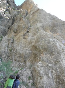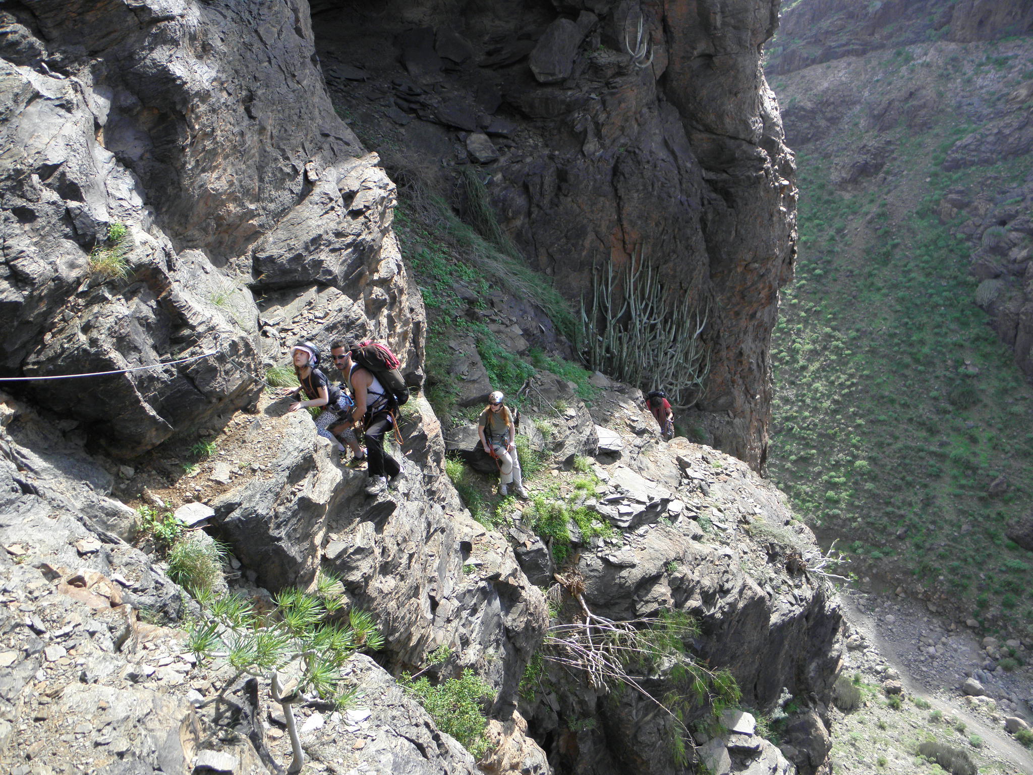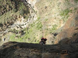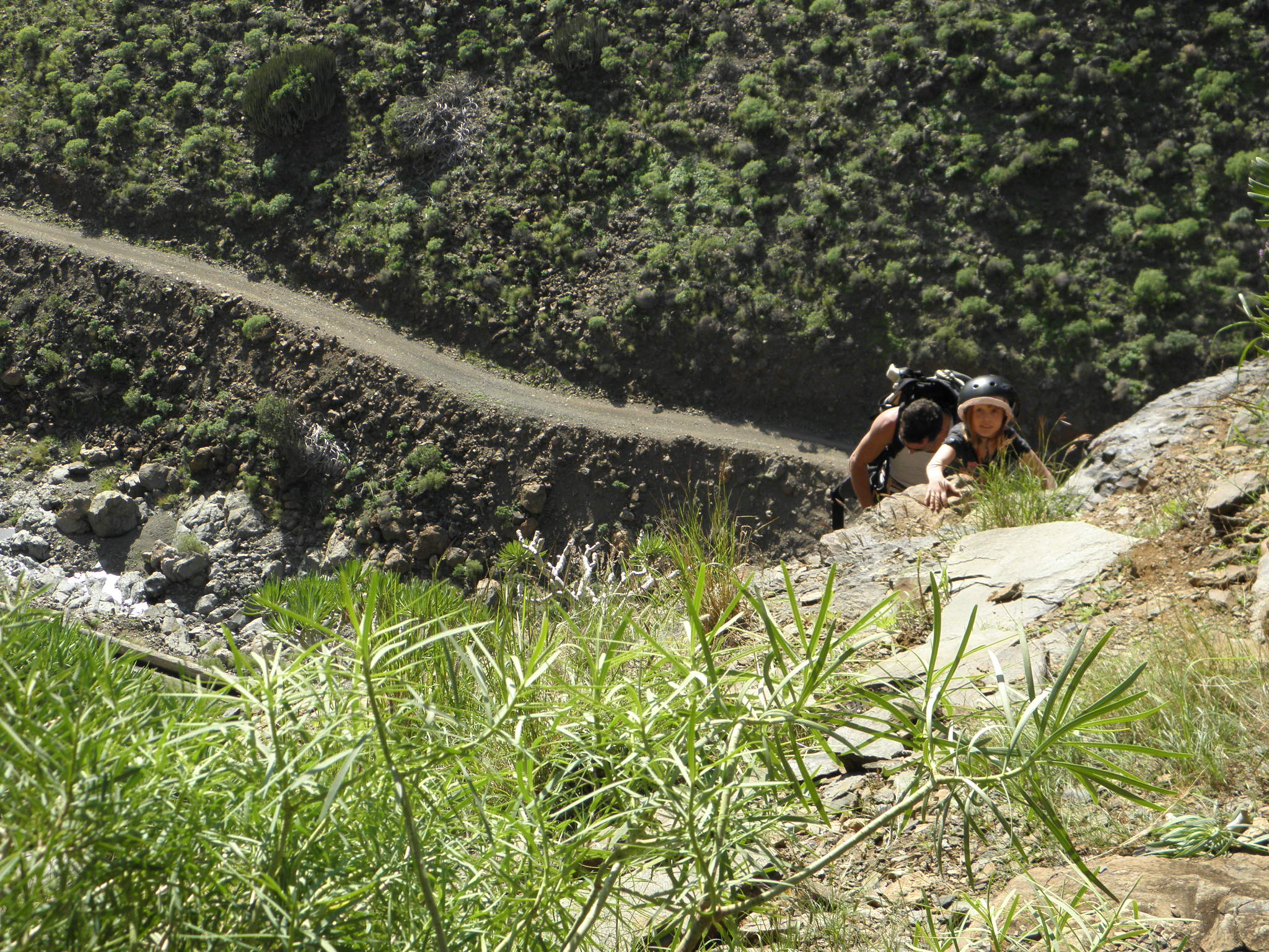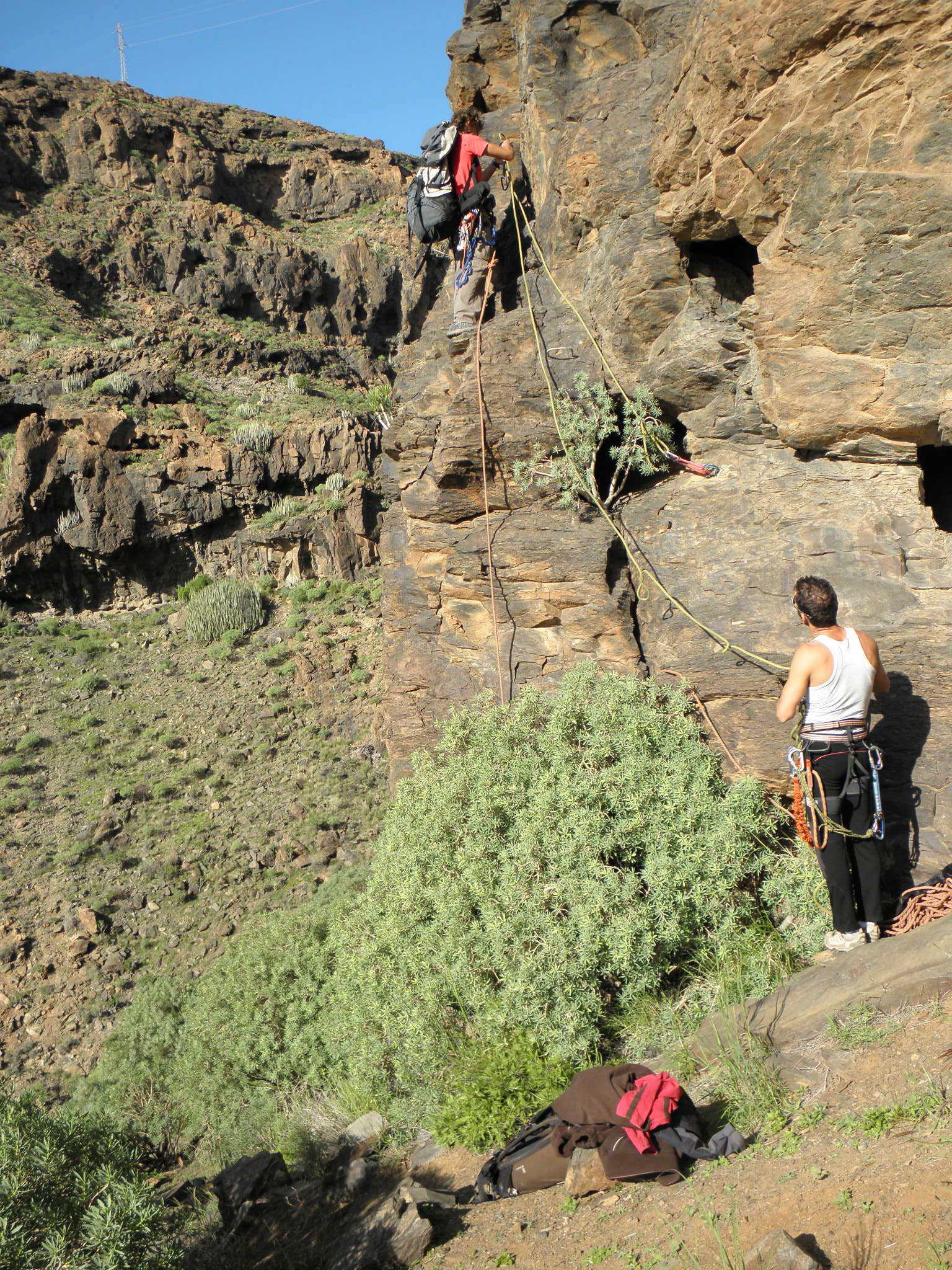 Toisella köydenpituudella Roquen eteneminen hidastuu melkoisesti. Voisi suorastaan arvailla, että hän on joutunut pois mukavuusalueeltaan. ”Olkaapa varovaisia, tämä on aika huonoa kiveä”, hän varoittaa, ja pian kiviä alkaakin sataa. Isoimmat hurahtelevat kiltisti ohi, mutta joku pienempi sattuu ilkeästi varpaaseeni. Carlos älähtää saadessaan pikkukiven päähänsä. Vammoilta kuitenkin säästytään, ja minä olen sangen tyytyväinen siihen, että päässäni on kypärä. Roquen eteneminen on nyt niin hidasta ja kavereiden kommunikaatio sen verran sävykästä, että arvaan pakittamisenkin olevan harkinnassa. Lopulta Roque tekee poikkarin ja pääsee ständille. Espanjankielinen juttelu jatkuu hetken, ja sitten Carlos kertoo: ”Okei. Jatketaan ylös päin.”