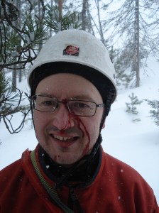 Neljännellä köydenpituudella ollaan pystyllä jäällä. Lumisen kallio-osion jäljiltä hakkuni ovatkin jo tylsät, ja kova pakkasjää lohkeilee muutenkin ihan hemmetisti. Saan naamaani ison jäälohkareen, ja kun nuolen huuliani, maistan veren. (Ja mun piti olla huomenna jotenkin edustavassa kuosissa!)