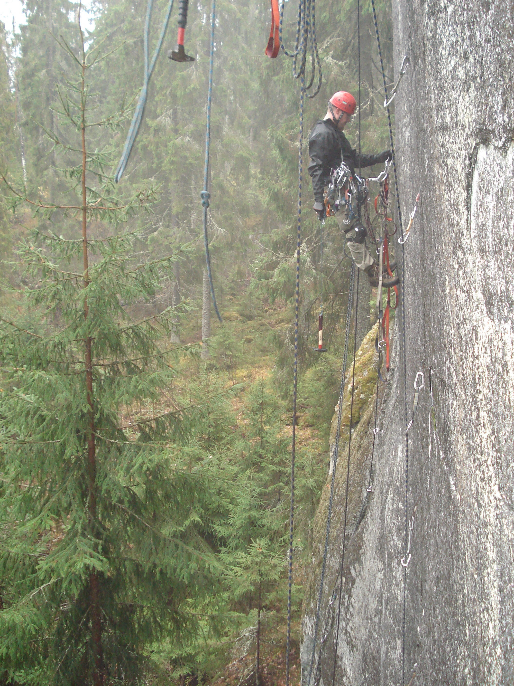 Lopulta olemme vaatteet märkinä perillä. Alkaa jo olla nälkä. Puemme kiipeilykamat päälle ja räkkäämme tavarat valjaisiin. Hörppäämme termarista hieman liian vähän teetä ja haukkaamme eväsleipää.