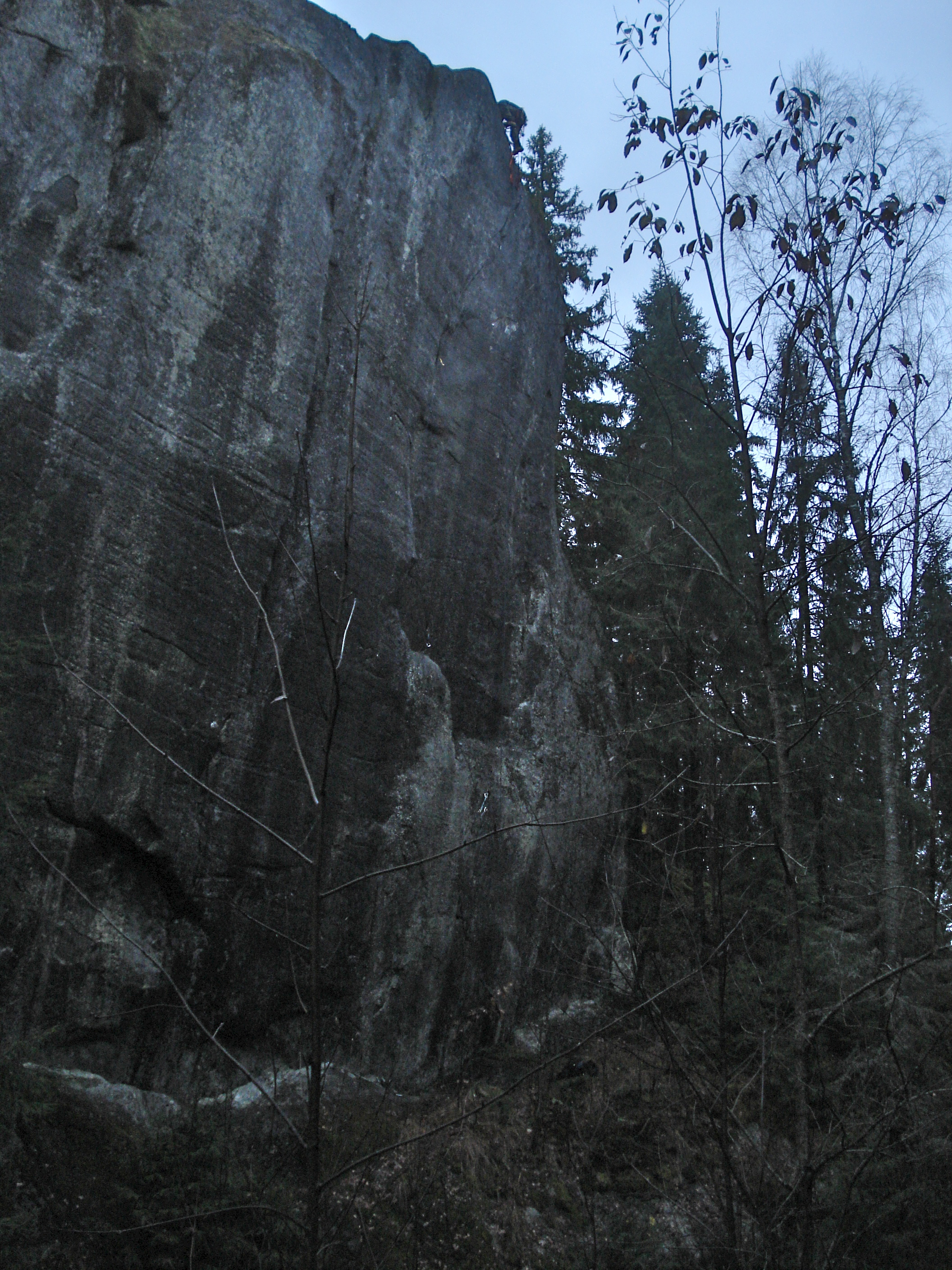Köysikumppanini ottaa ensimmäisen liidivuoron. Alun jää menee kivasti, mutta mikstaosuus onkin vaikeampi kuin mitä olimme arvioineet. Hän pysähtyy kruksiin kuin seinään, hakee ratkaisua sieltä, hakee täältä, ja löytää sen lopulta hieman vähemmän ilmeisestä suunnasta. Nyt hän taas etenee, mutta välivarmistuksille ei ole paikkaa. Katselen menoa jotenkin henkisesti turtana. Mitä, jos hän sattuisikin putoamaan? Olisi äkkiä tajuttomana, tonennäköisesti monin paikoin murtuneena. Kauanko menisi saada apua paikalle? Mikä tämän paikan nimi olikaan? Alkoiko se Glo- tai Flo- tai Flø- tai jotain? Ja oliko tällä putouksella joku nimi? Hänen suunnitelmansa, kaikki tieto on hänen ohuen kallonsa sisällä.