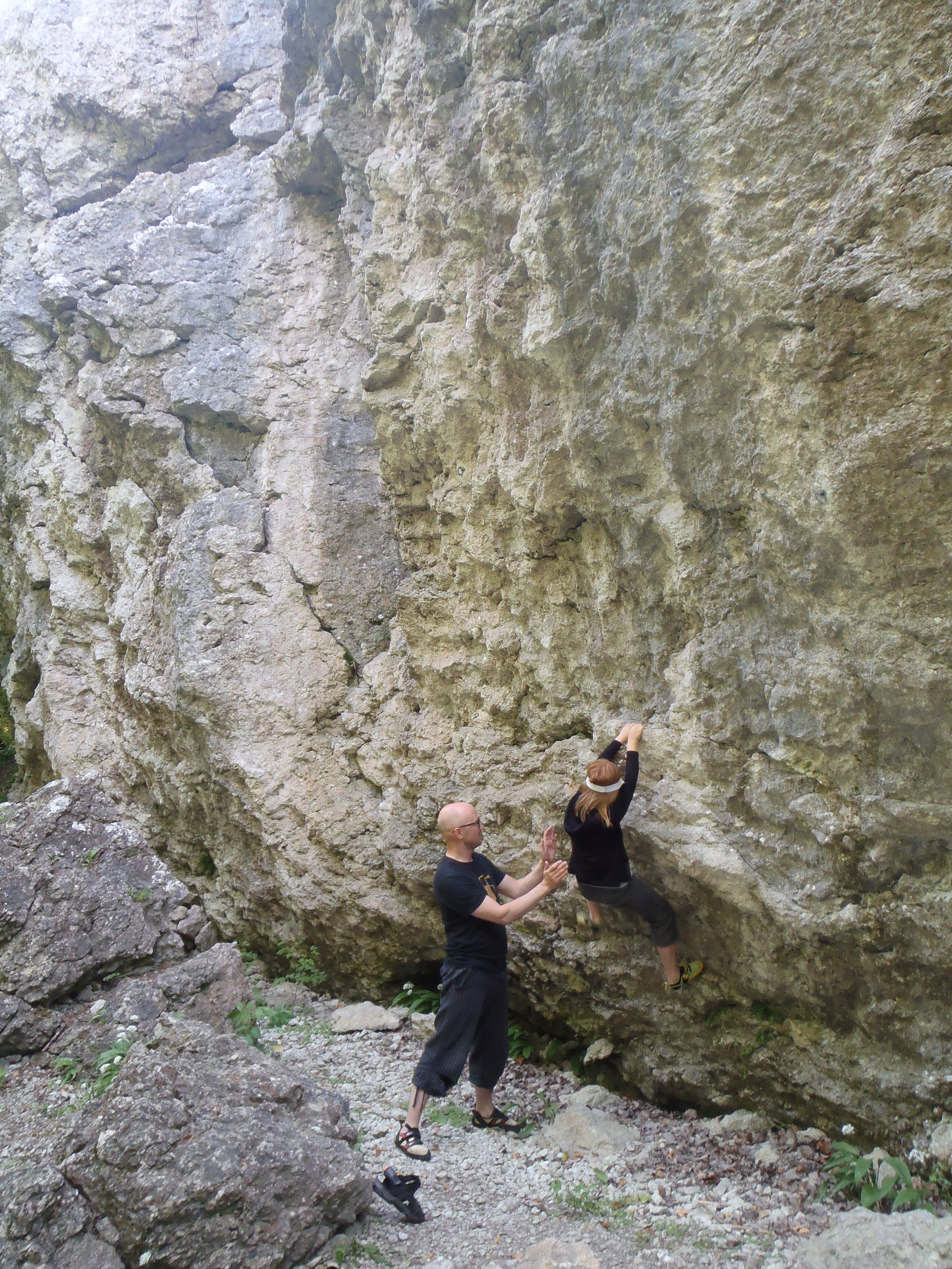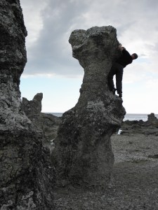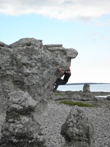 Annamari ja minä käymme kiipeämässä Prestenin Vestpillarenin neljää ensimmäistä köydenpituutta. Kallio on märkää ja tuuli kylmä. Kruksiliidini ei mene puhtaasti, vaan joudun vetämään jatkoista. Ei tunnu kauhean vahvalta vieläkään, mutta ständityöskentely alkaa sujua. Takanamme tuleva Rollon tiimi jatkaa isolta hyllyltä jonnekin ylemmäs.
