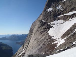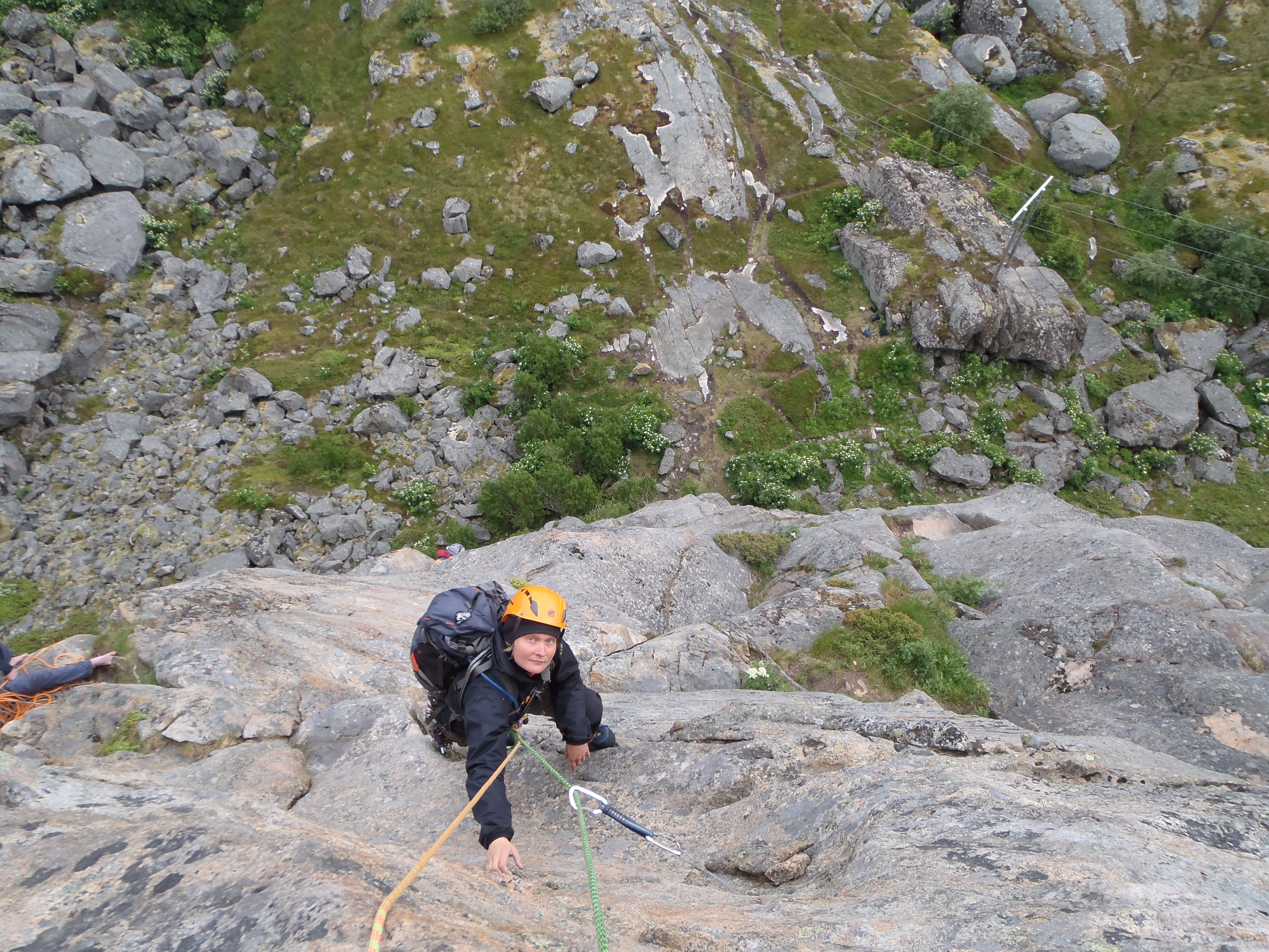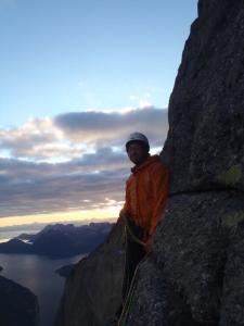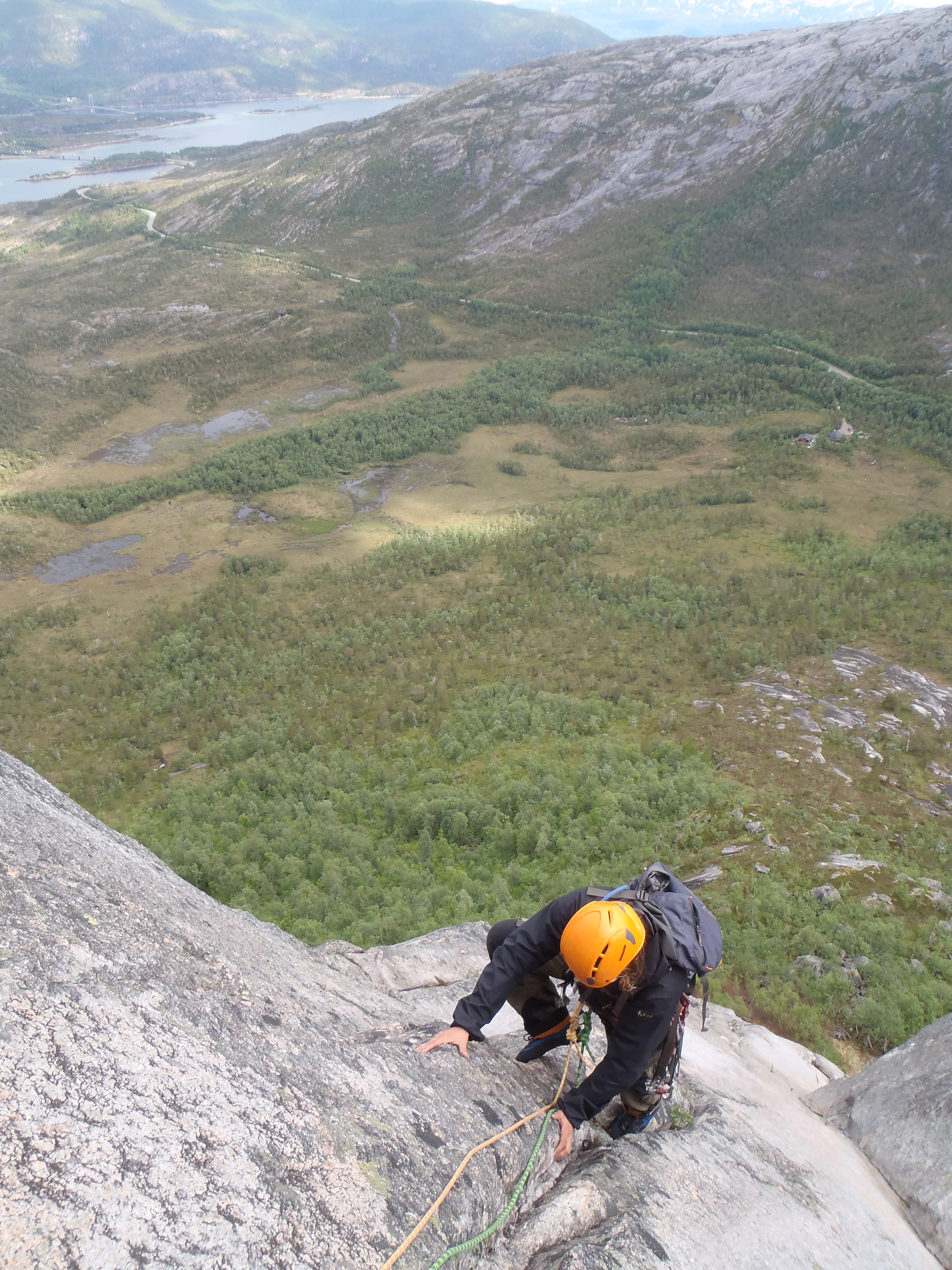 Kiipeäminen on pääosin helppoa mutta laadukasta. Ständeillä tulee kuitenkin kylmä. Säätiedote oli perusleiriin, kilometrin korkeudella on tietenkin kymmenisen astetta kylmempää. Ja se tuuli kiertää inhottavasti idän puolelta kimppuun. Norjalainen lämpöaalto pureutuu luihin ja ytimiin. Olisipa untuvatakki! Onneksi osa ankkuripaikoista on suojassa; pystymme kuitenkin etenemään.