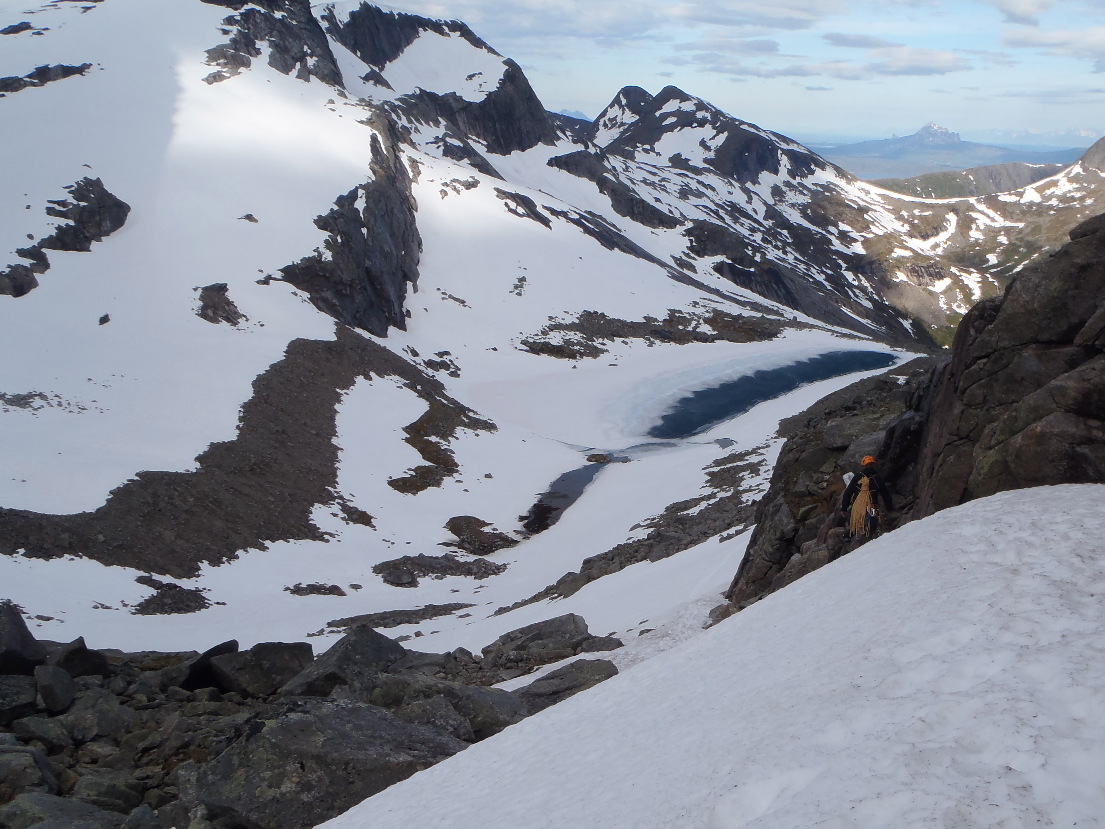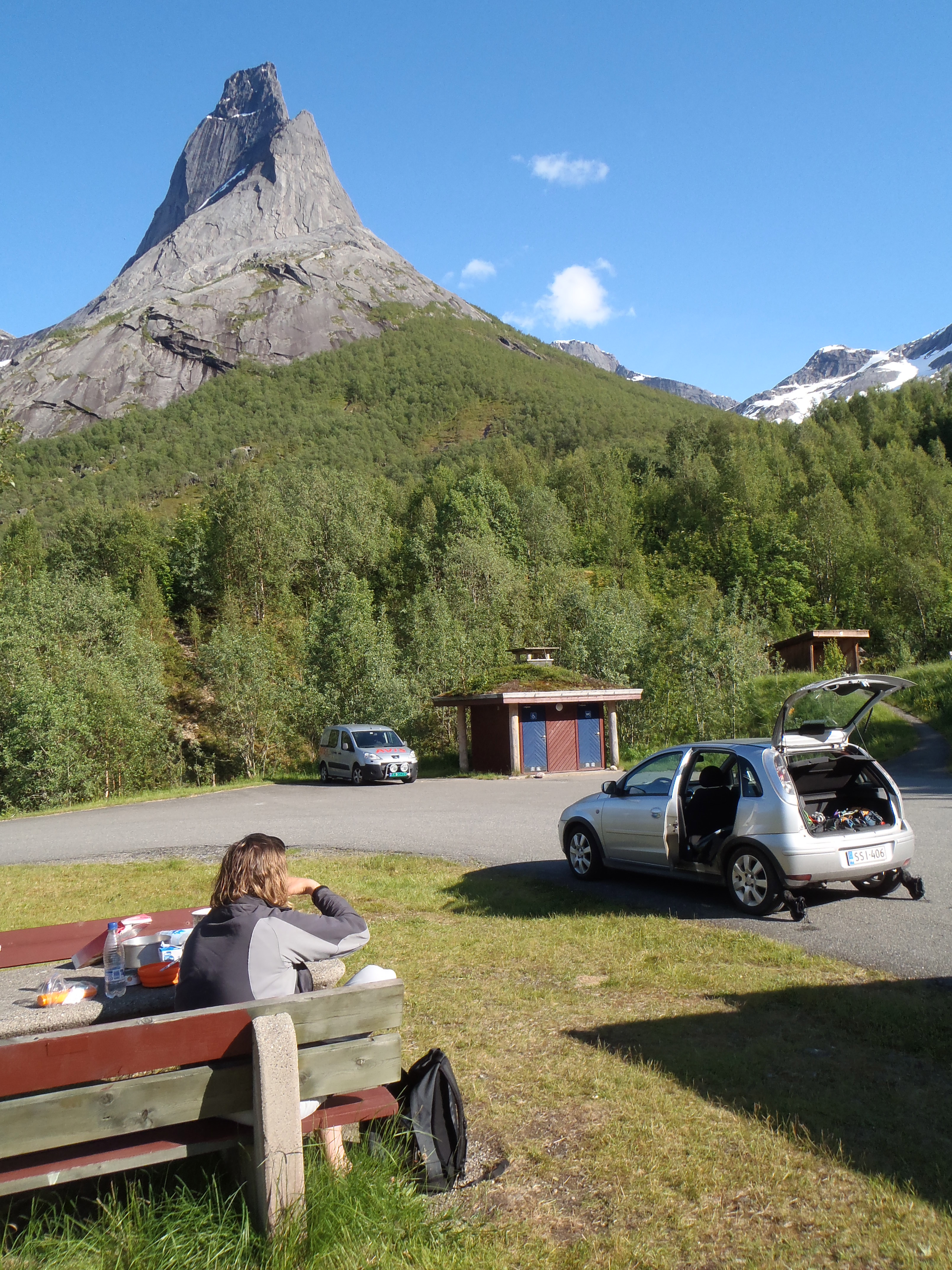 Vuonon rannassa sijaitseva Stetindin perusleiri on hyvä paikka: on roskikset, vessa, juokseva vesi, ruokapöydät ja miljoona mittarimatoa. Ja ennen kaikkea kunnon näkymä 1391 metriä korkealle vuorelle. Mutta näkymää ei voi jäädä ihailemaan, sillä huipulle on vielä 1286 korkeuserometriä jäljellä.