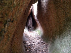 Kuvat 2-3: Högbergetin luola Kirkkonummella. Kilometri kävelyä, 20 minuuttia bussissa, sitten vielä pari kilometriä kävelyä (aikuisten kesken tämä voisi olla yhtä hyvin pyörämatka). Lisäarvoa tälle pimppimäiselle onkalolle antoi sen etsimiseen käyttämämme aika ja rinteissä kolutessamme vuodattamamme hiki. Kansalaisen karttapaikka ”Hei, täällähän on ihan hyvä kenttä!” auttoi lopulta tarkasti kohdalle.
